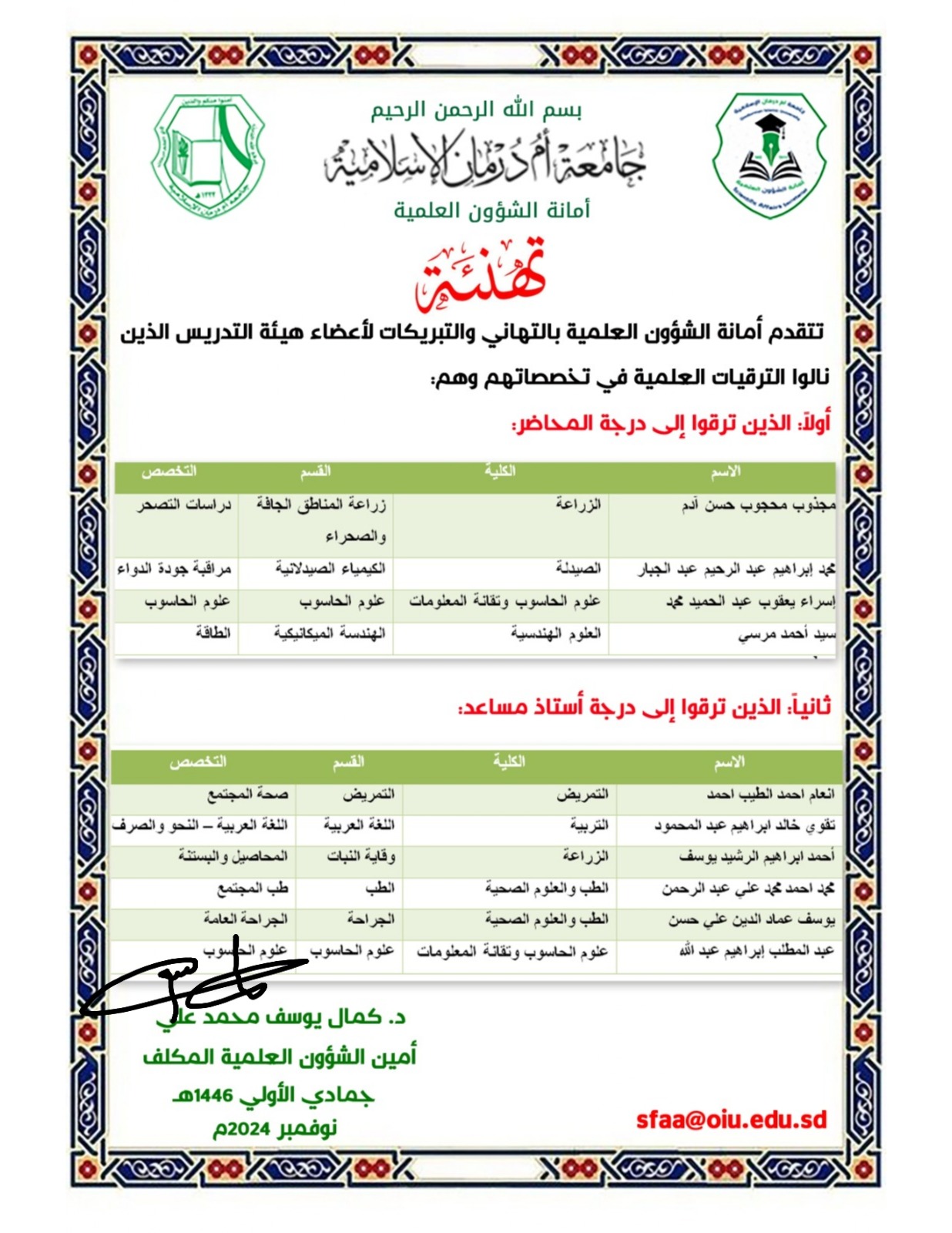 تتقدم الإدارة العليا لجامعة أم درمان الإسلامية الممثلة في البروفيسور الفاتح الحبر عمر أحمد مدير الجامعة والبروفيسور طارق حسن بن عوف نائب مدير الجامعة و أمانة الشؤون العلمية ومجتمع الجامعة لاعضاء هيئة التدريس الذين نالوا الترقيات العلمية في تخصصاتهم وهم :