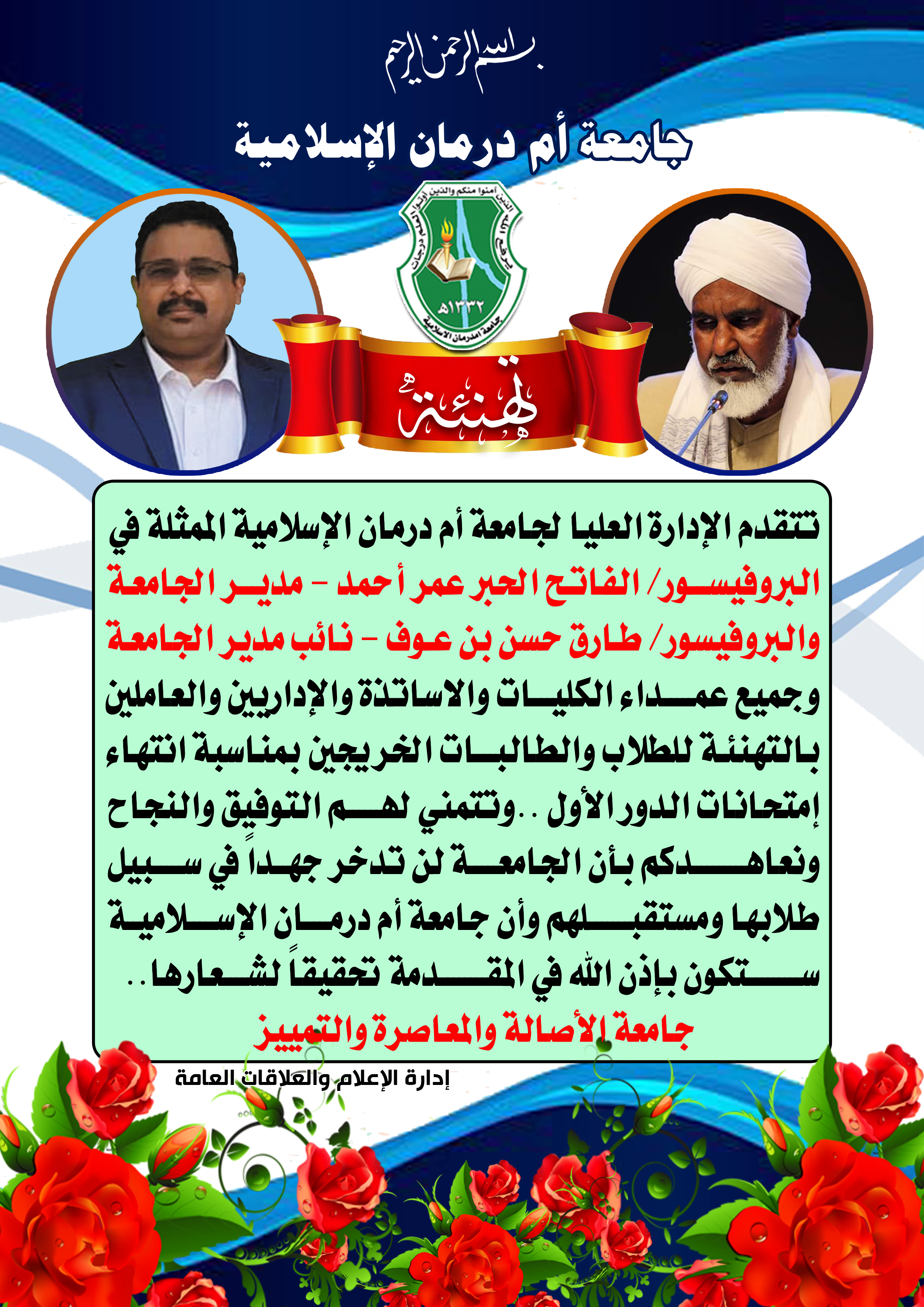 تتقدم الإدارة العليا لجامعة أم درمان الإسلامية الممثلة في البروفيسور الفاتح الحبر عمر أحمد مدير الجامعة والبروفيسور طارق حسن بن عوف نائب مدير الجامعة وجميع عمداء الكليات والاساتذة والإداريين والعاملين بالتهنئة للطلاب والطالبات الخريجين بمناسبة انتهاء إمتحانات الدور الأول ..وتتمني لهم التوفيق والنجاح ونعاهدكم بأن الجامعة لن تدخر جهداً في سبيل طلابها ومستقبلهم وأن جامعة أم درمان الإسلامية ستكون بإذن الله في المقدمة تحقيقاً لشعارها..
