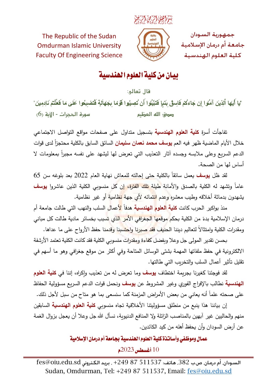بيان كلية العلوم الهندسية - جامعة ام درمان الإسلامية - حول اعتقال الدعم السريع للعم يوسف محمد النعمان