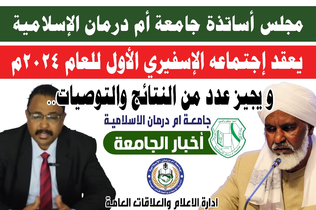عقد مجلس أساتذة جامعة أم درمان الإسلامية اجتماعه الإسفيري (الاستثنائي) الأول للعام ٢٠٢٤م برئاسة الإدارة العليا للجامعة المتمثلة في البروفيسور الفاتح الحبر عمر أحمد مدير الجامعة والبروفيسور طارق حسن بن عوف نائب مدير الجامعة اليوم الثلاثاء ٢٨شوال ١٤٤٥هجرية الموافق ٧مايو ٢٠٢٤م