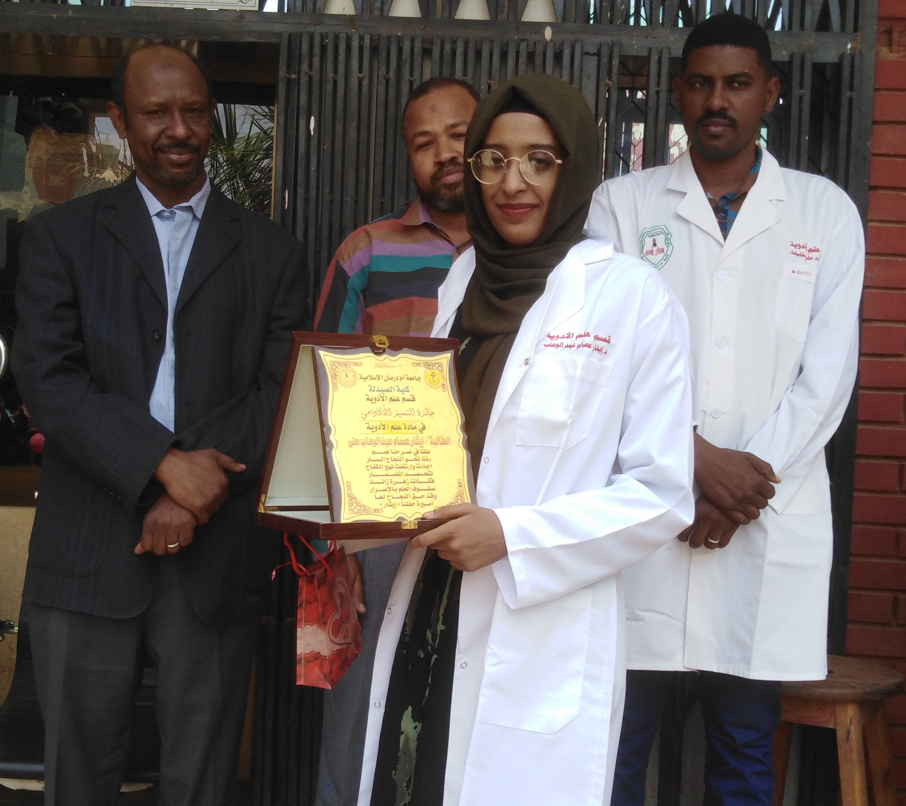 في إطار شحذ الهمم وتحفيزا لتجويد الأداء والاجتهاد والمثابرة وتقديرا للتميز أقامت كلية الصيدلة قسم علم الأدوية صباح اليوم الأربعاء 25 مايو 2022م احتفال وتكريم للطالبة ايثار عبد الوهاب على الفائزة ب "جائزة التميز الأكاديمي" في مادة علم الأدوية بساحة الكلية بالمدينة الجامعية بأبي سعد وسط حضور كبير تقدمه عميد الكلية الدكتور الطيب سليمان الأمين ونائب العميد الدكتور محمد علي خليفة والدكتورة مرام محمد الجيلي وكل رؤساء الأقسام والموظفين والعاملين بالكلية وعدد غفير من الطلاب والطالبات وتخل...